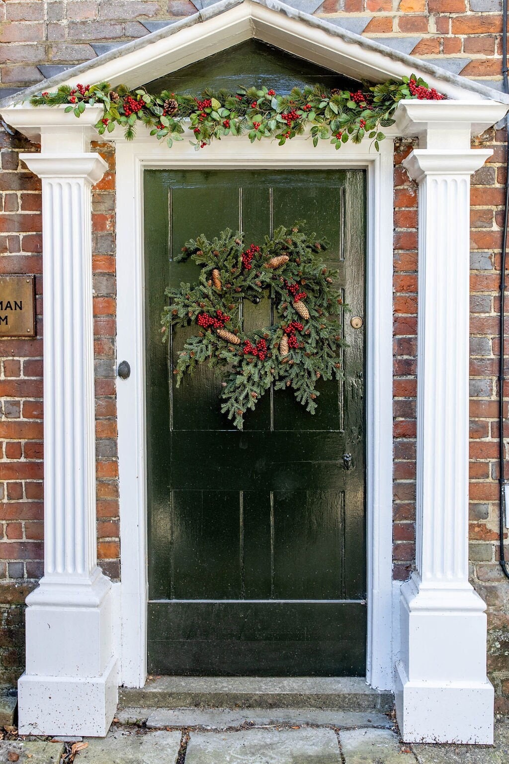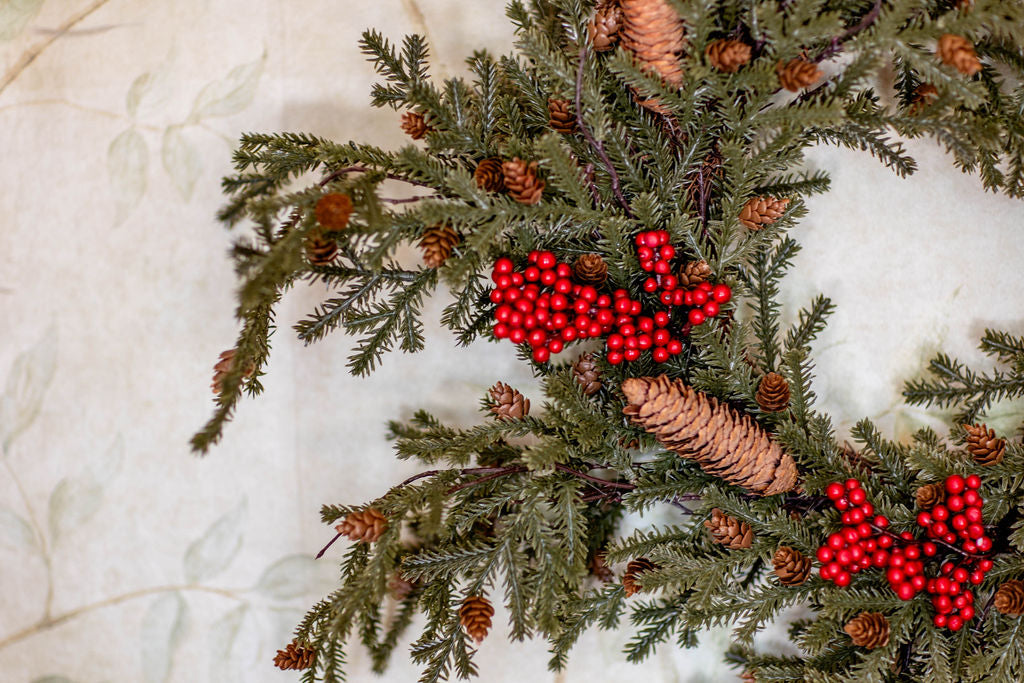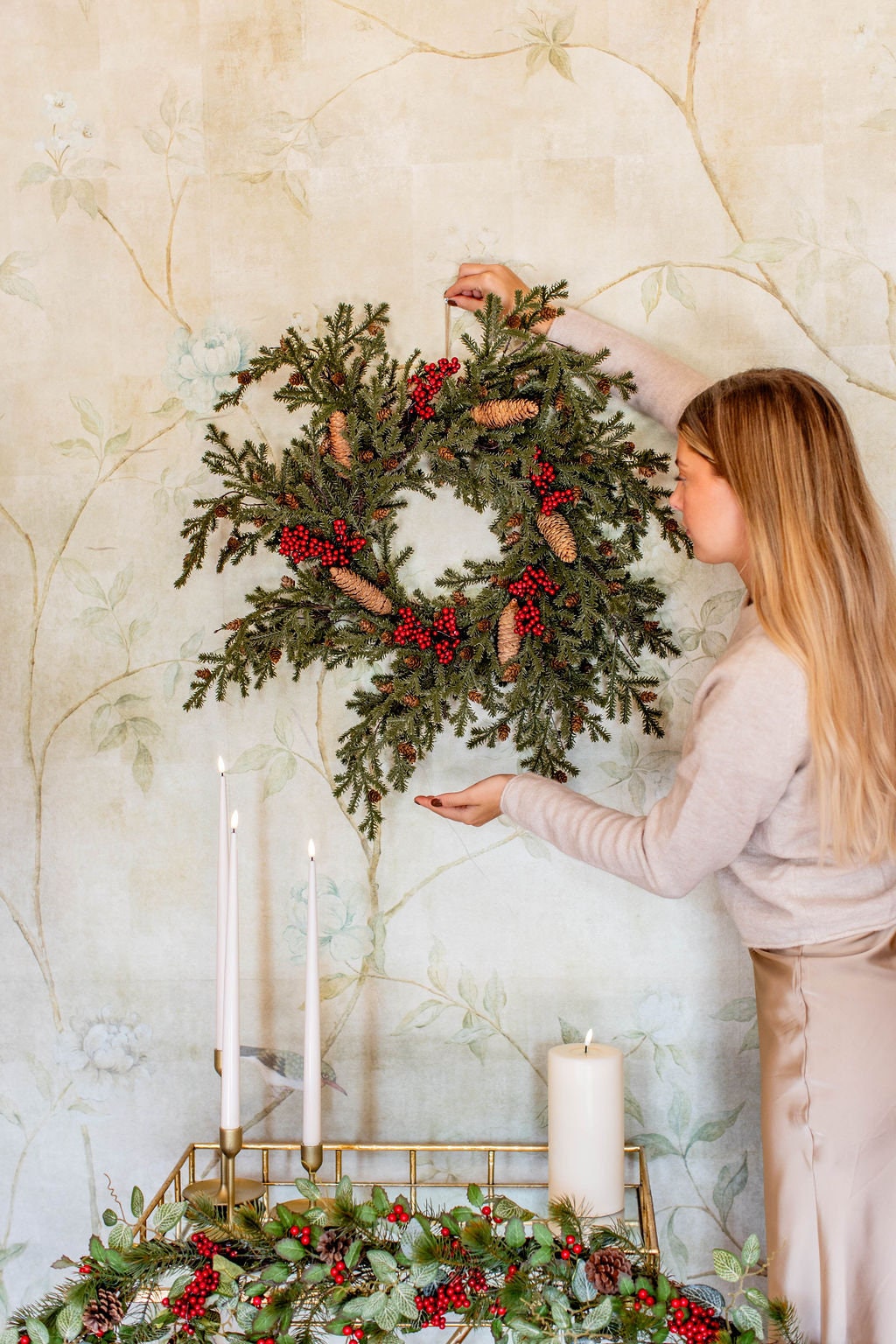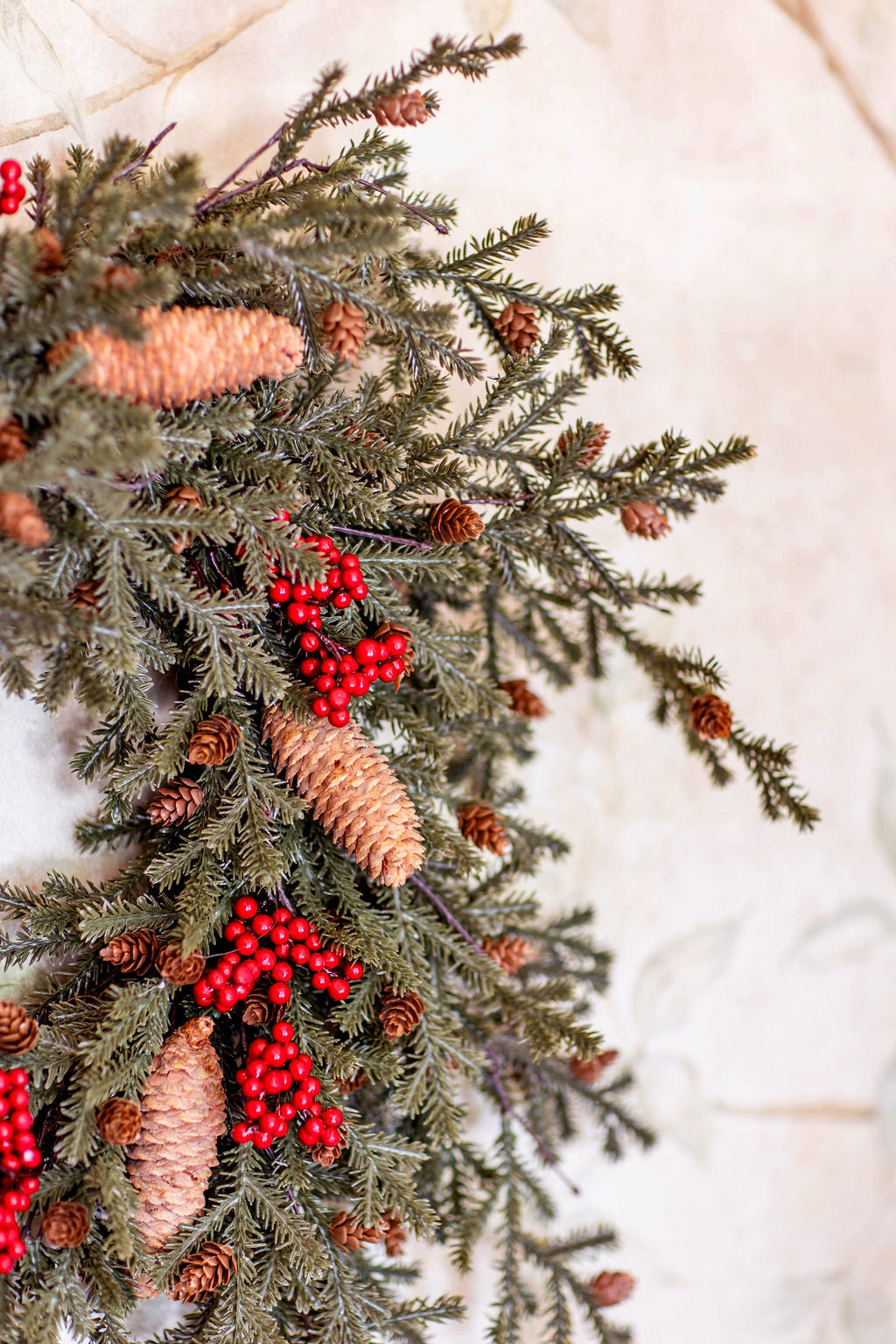 A luxury faux wreath in a wild loose design created using realistic textured faux pine with glossy red berries and rope feature