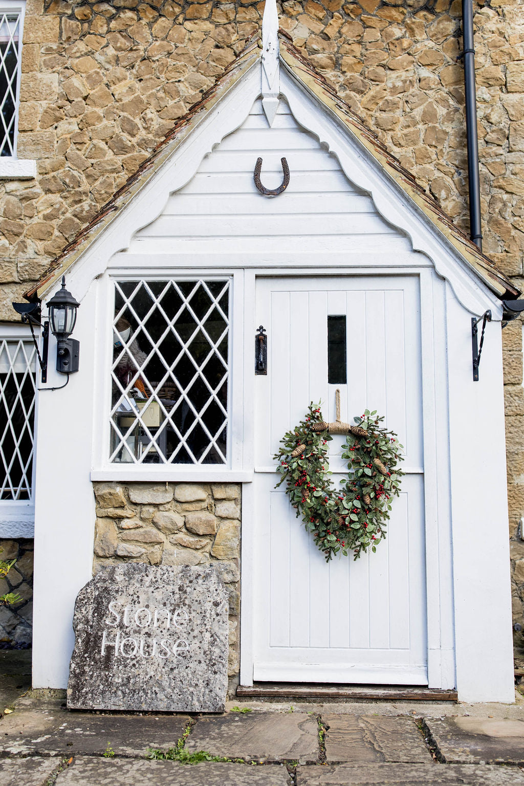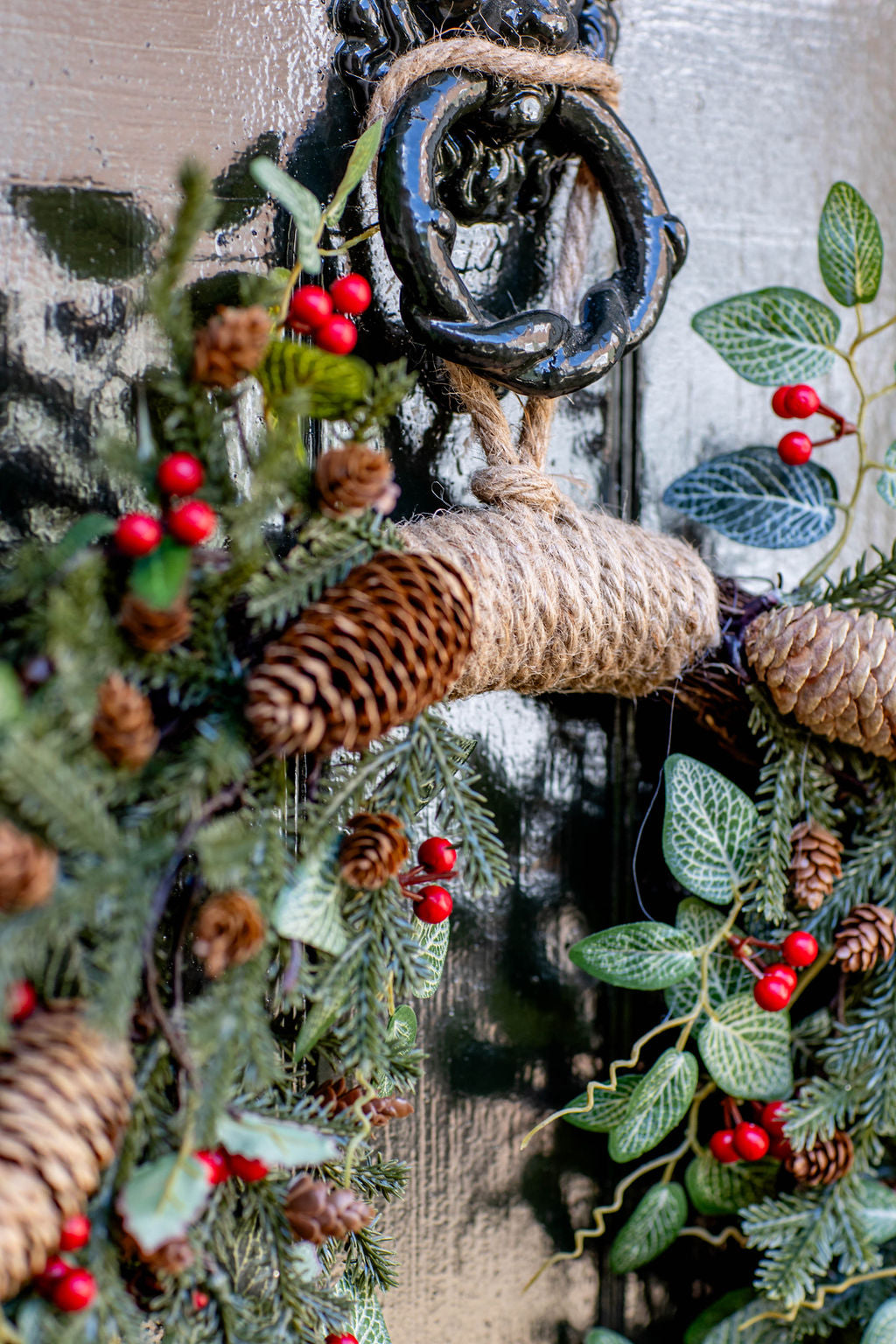 A large and full luxury faux door wreath in a modern teardrop style with rustic rope hanging feature - a real statement piece!