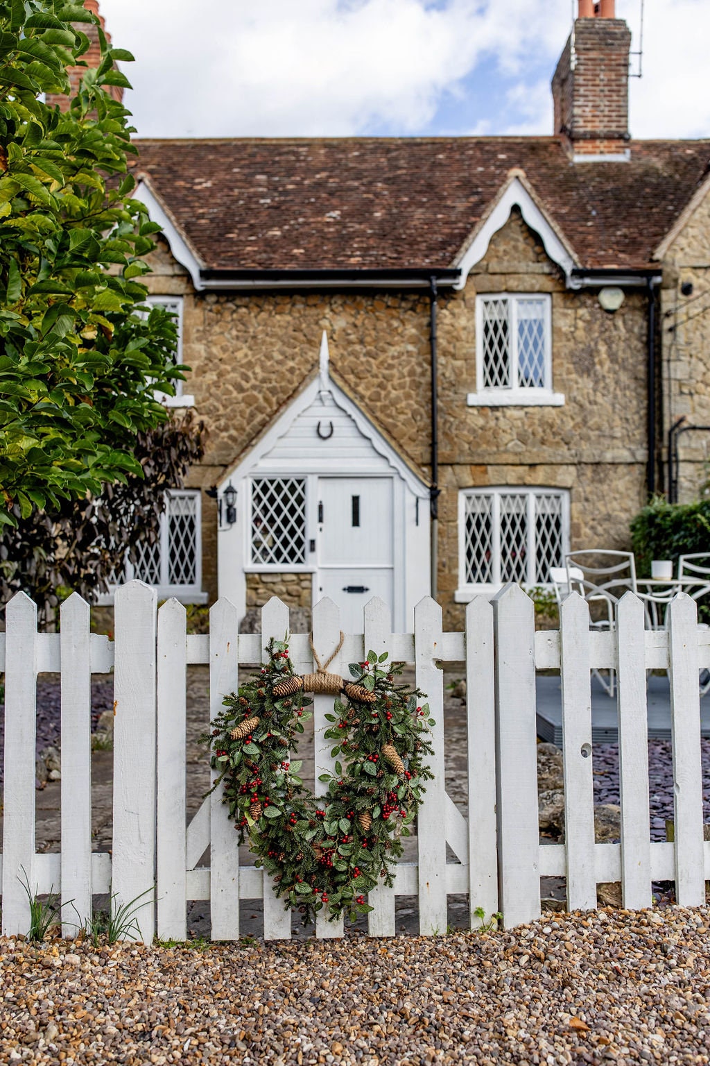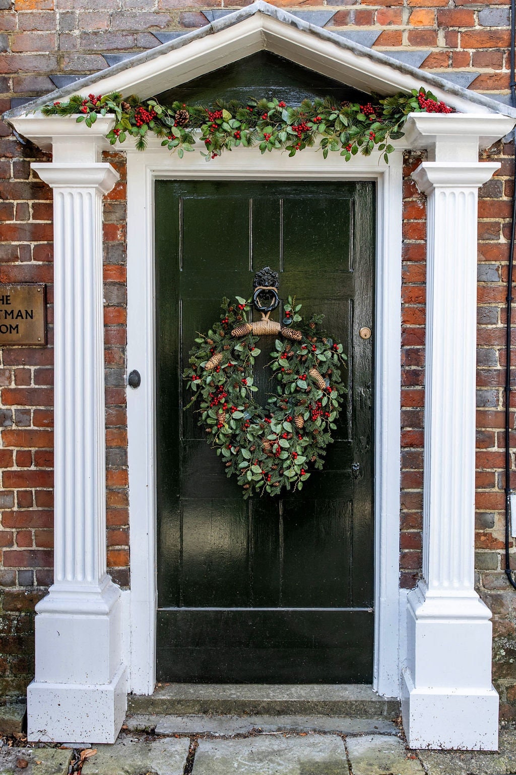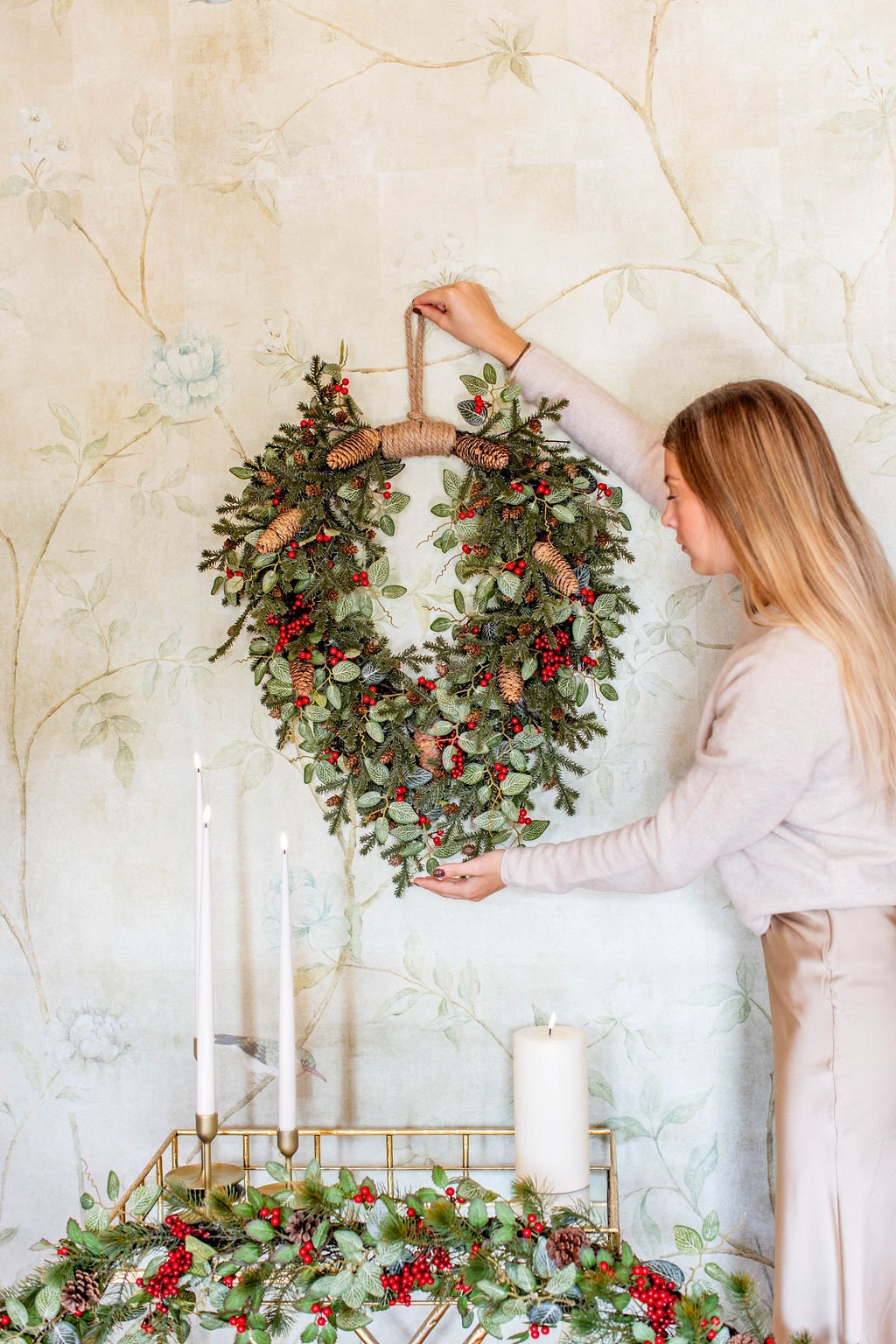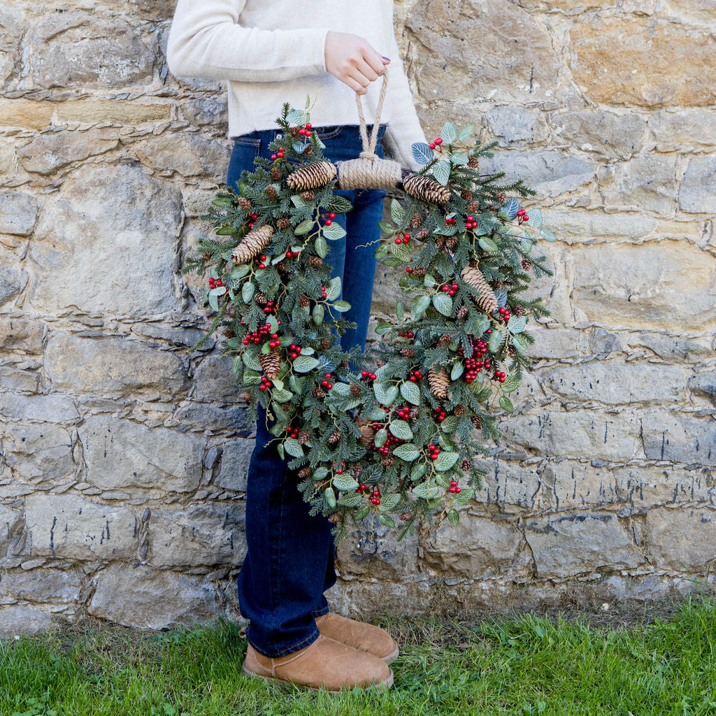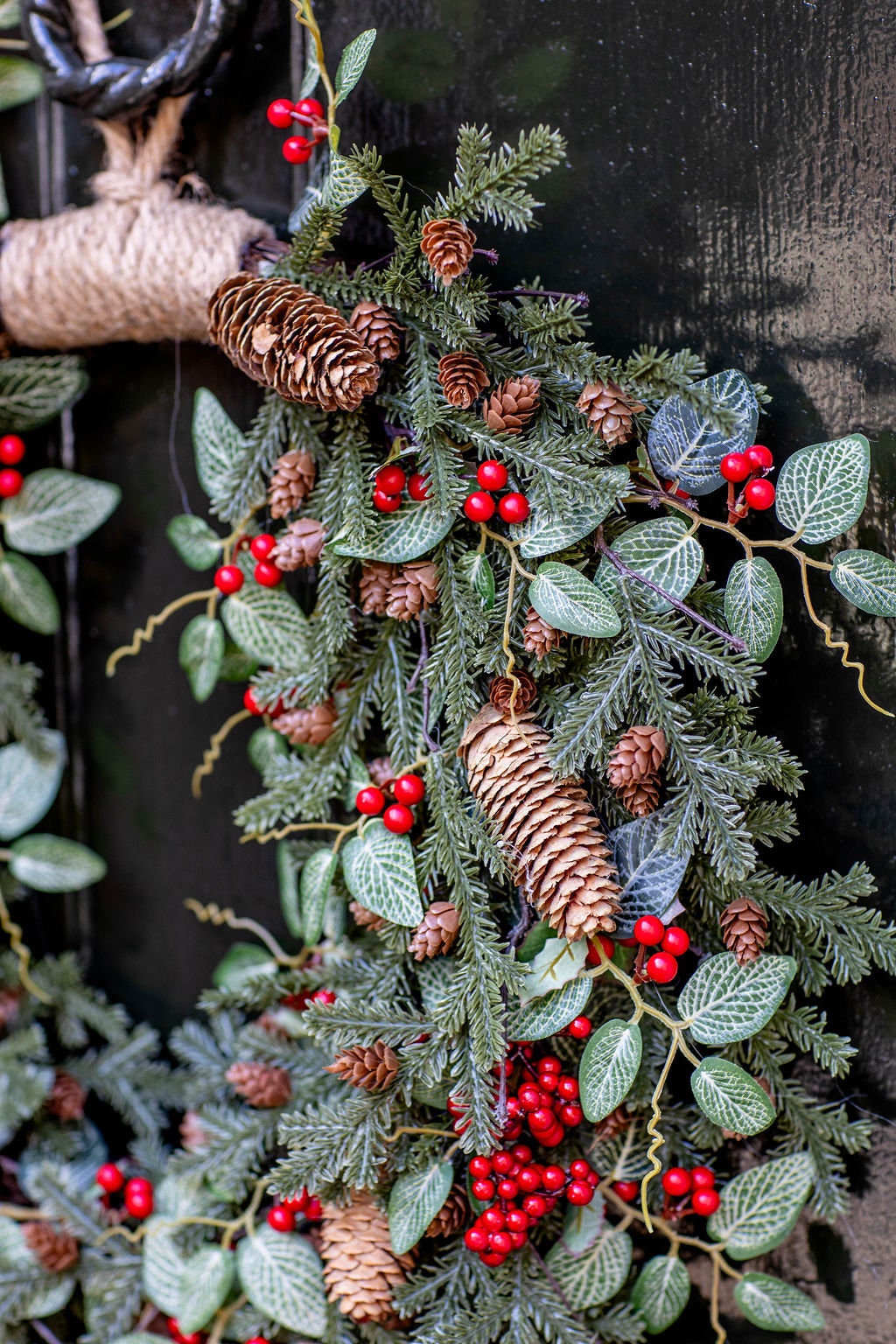 Created using faux pine and winter foliage with deep red glossy berries and a rustic rope handle giving it a highly realistic Christmas look.
